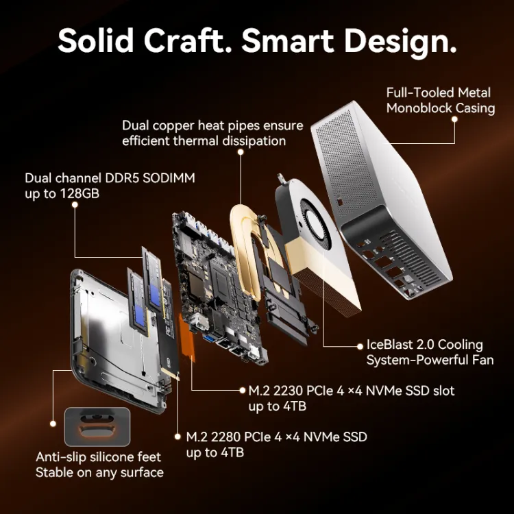 - Storage: Dual-channel DDR5 memory (up to 128GB) and dual M.2 slots (2280+2230) for up to 8 TB of PCIe 4.0 SSD storage expansion