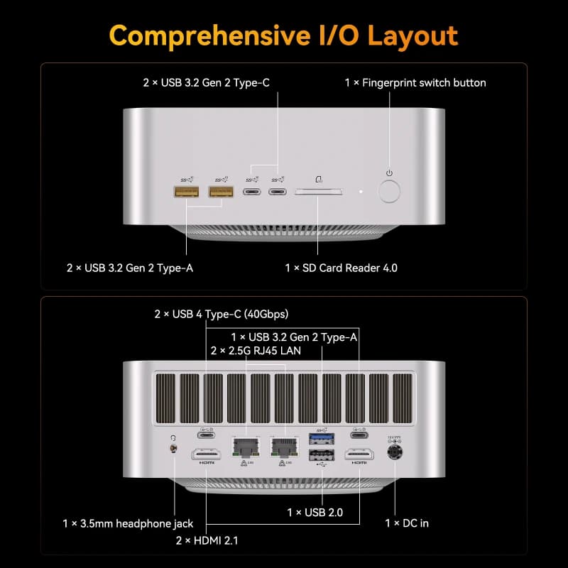 Industrial Build & Pro-Connectivity: A precision CNC-machined aluminium alloy chassis housing Wi-Fi 7, Bluetooth 5.4, dual 2.5G Ethernet, and integrated fingerprint security—combining rugged durability with elite networking.