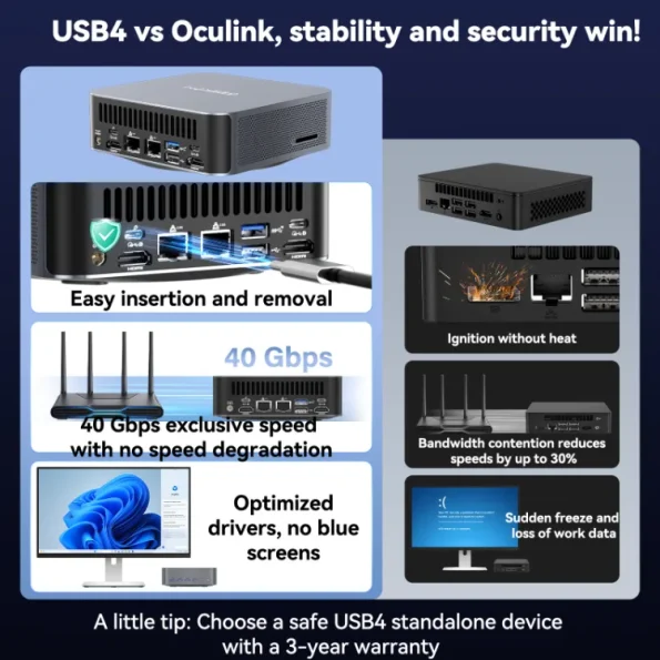 - Versatile USB4: All-in-one – Up to 40Gbps data transfer, 8K video output, connecting an eGPU or external SSD, fast charging, all with a single USB-C cable. More convenient and versatile than OCuLink, no complicated setup or special cables required.