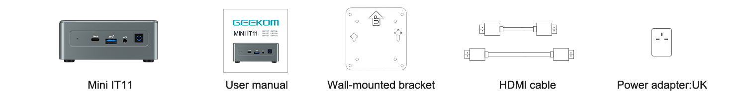 | What’s In The Box | 1 x Mini IT11 Mini PC 1 x VESA Mount 1 x Power Adapter 1 x HDMI Cable 1 x User Guide 1 x Thank You Card |