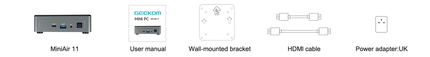 | What’s In The Box | 1 x Mini Air 11 Mini PC 1 x VESA Mount 1 x Power Adapter 1 x HDMI Cable 1 x User Guide 1 x Thank You Card |