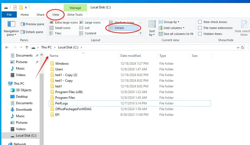 - The “View” tab is at the top of the File Explorer window. From the drop-down menu, choose “Details.” This will show more details about each file.