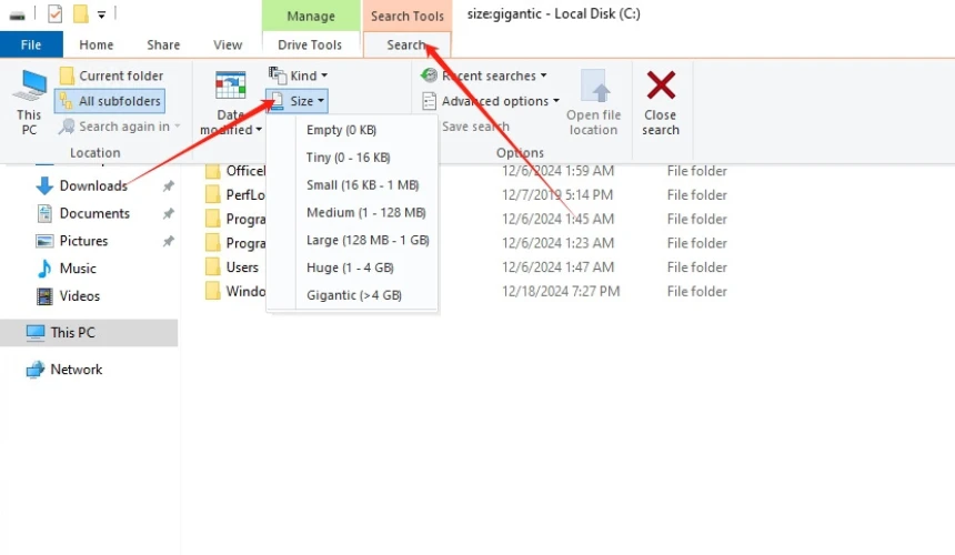 - In the search bar, type “size:gigantic” without the quotes, and then press “Enter.”