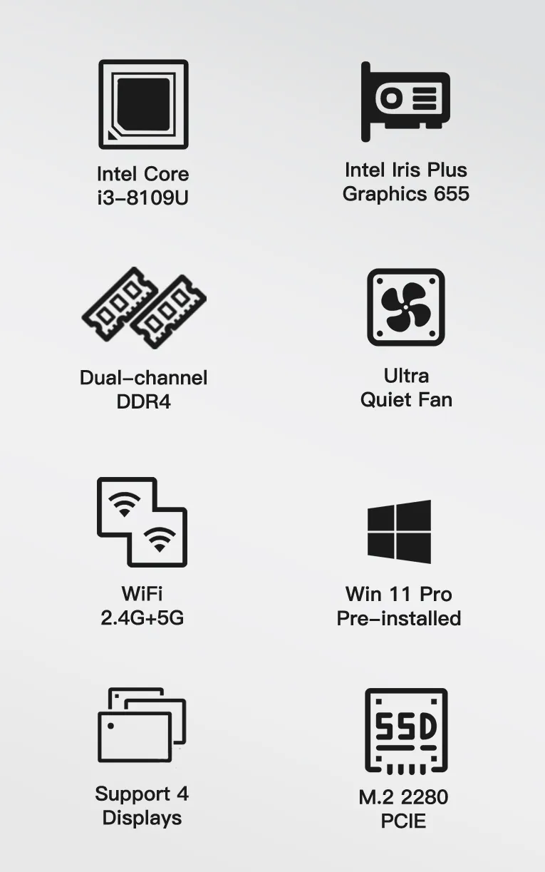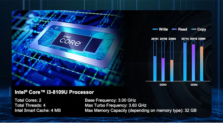 | CPU | 8th Gen Intel® Core™ i3-8109U (2 Cores, 4 Threads, 4M Cache, up to 3.60 GHz) TDP 28W |