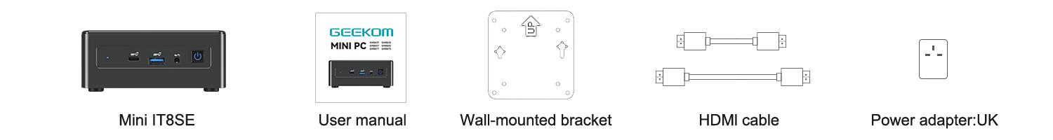 | What’s In The Box | 1 x Mini IT8SE Mini PC 1 x VESA Mount 1 x Power Adapter 1 x HDMI Cable 1 x User Guide 1 x Thank You Card |